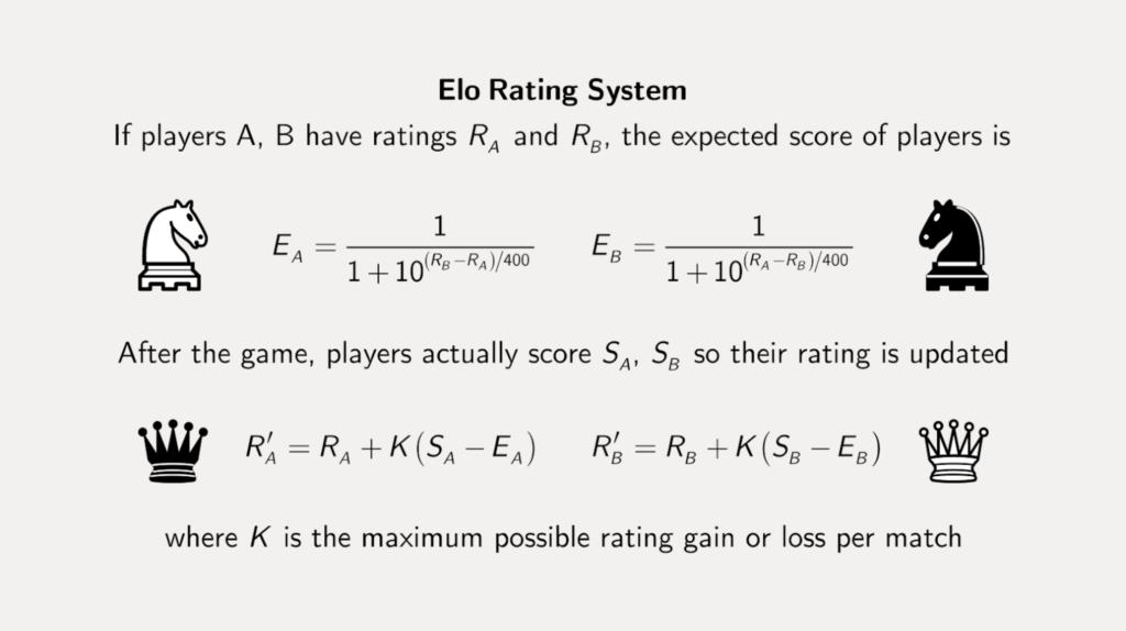 Indien speler A een rating van 1000 heeft en B 1100 dan zal speler A na een gewonnen wedstrijd een rating van 1006 krijgen en speler B 1094.