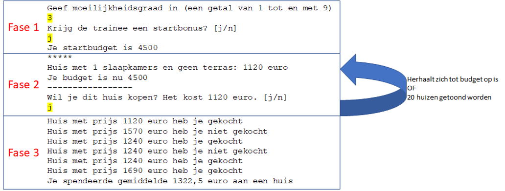 - Fase 2 (8 punten): De trainee krijgt huizen aangeboden (willekeurig) waar hij op kan bieden. Van zodra het budget op is wordt naar de volgende fase doorgegaan.