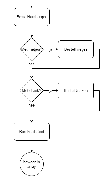 Hier de algemene flow van de applicatie (merk op dat de methoden BestelFrietjes,BestelDrinken en BerekenTotaal allemaal vanuit BestelHamburger worden aangeroepen, wat later wordt uitgelegd)