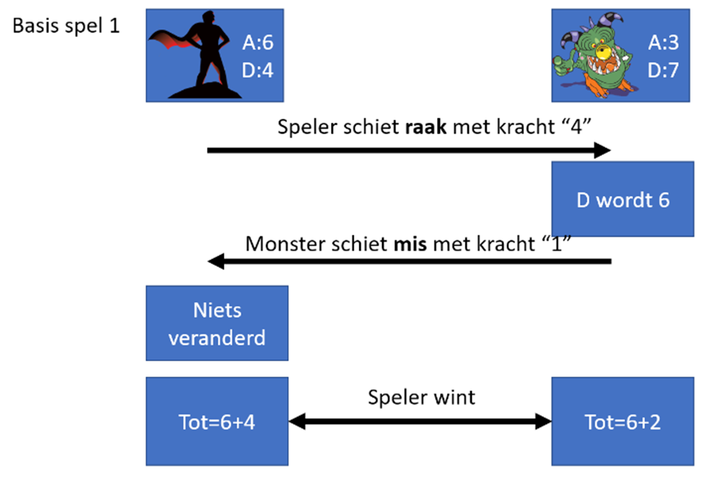 - Om de beurt mag een van beide spelers “schieten”. Ze gebruiken hierbij hun aanvalskracht als maximum-kracht dat ze kunnen schieten. * Enkel indien met een kracht die maximum 1 verschilt van de verdediging van het doel zal er geraakt worden. Als dus het monster een verdediging van 5 heeft dan moet de held met een kracht van 4,5 of 6 schieten om te raken.