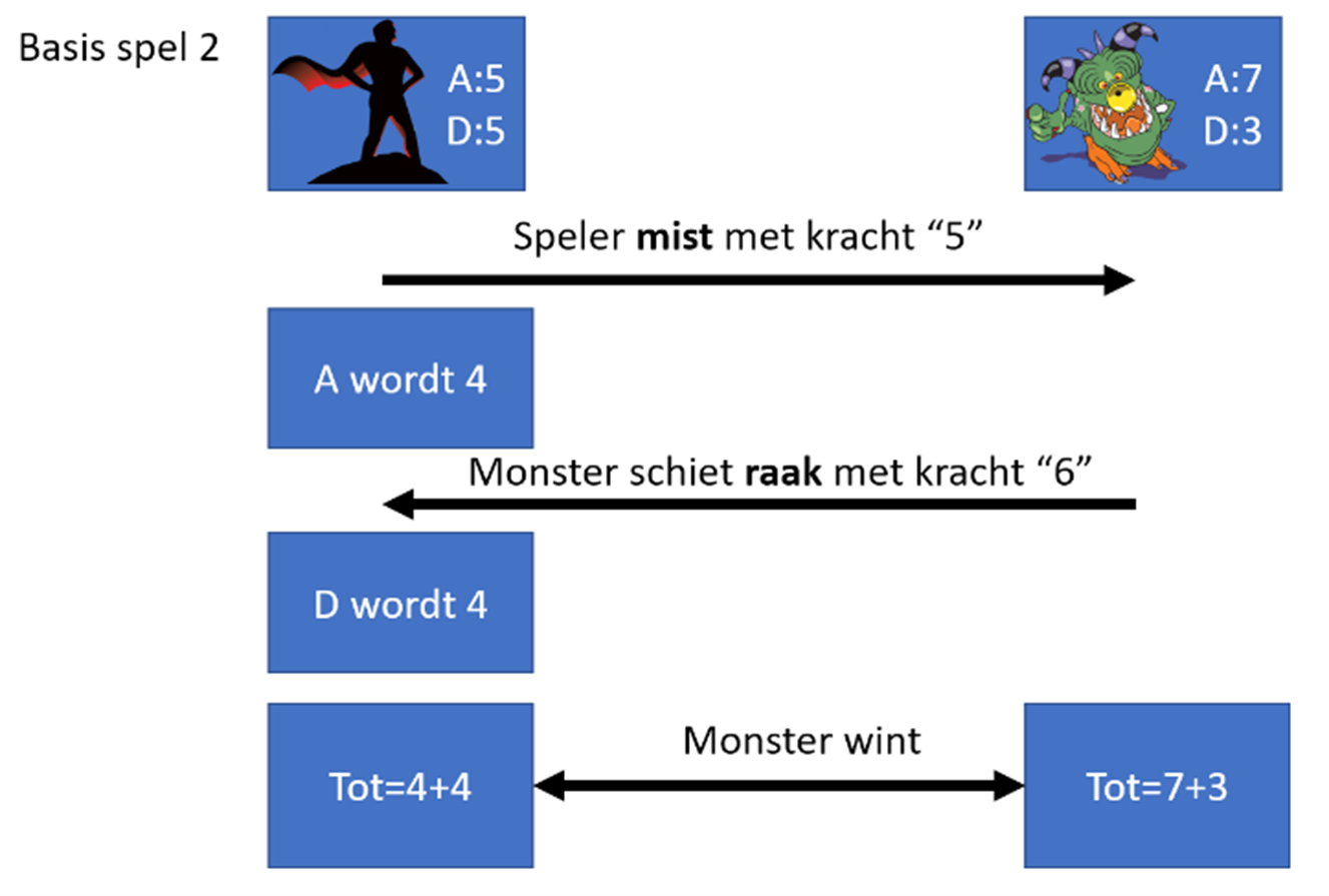 - Nu mag het monster aanvallen: het monster (de computer) kiest een willekeurig getal tussen 1 en de aanvalskracht van het monster (in de training dus tussen 1,2,3 en 4)