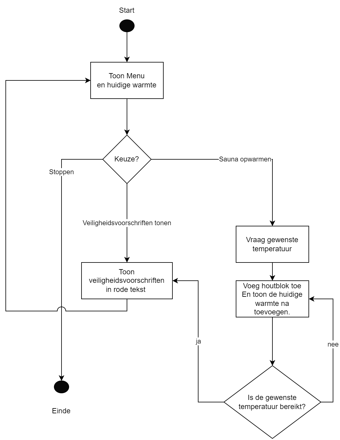 Gegeven volgende flowchart voor een sauna. De gebruiker kan via een menu'tje ingeven wat hij wenst te doen. Pas de flowchart toe en houdt rekening met volgende zaken: