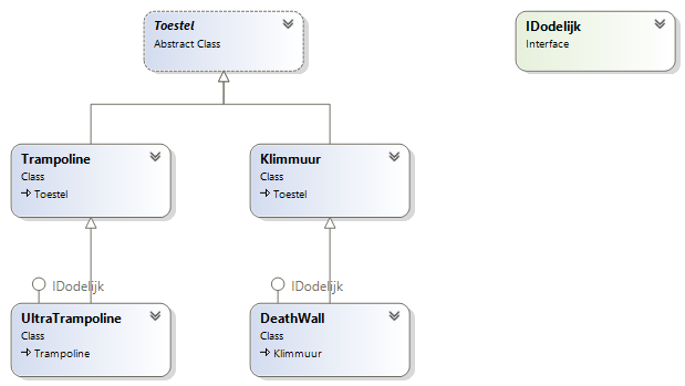 IDodelijkinterface en zal altijdfalseteruggeven bijVeiligheidsActief(de beveiligingsinstelling van een Ultratrampoline kan dus nooit anders zijn). - De moeilijkheidsgraad van deze klasse is "10 + de waarde die in de default constructor van de