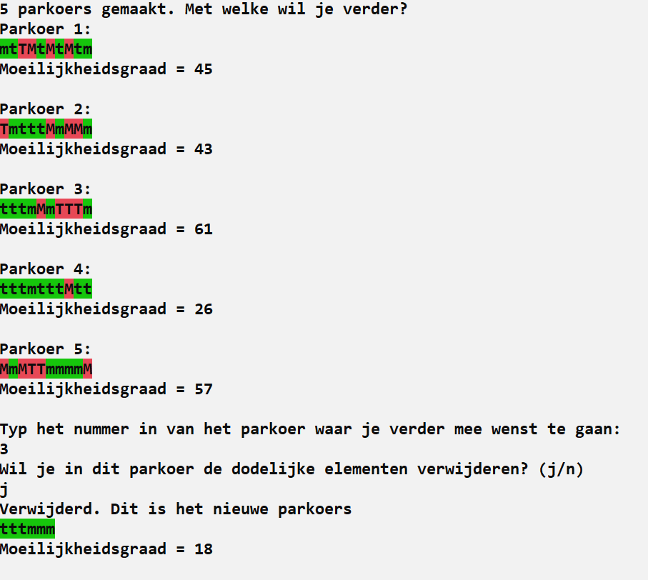IDodelijkeobjecten worden uit de lijst van het gekozenParkoerobject gehaald). - Finaal wordt het gekozen parkoers nogmaals getoond, al dan niet zonder de dodelijke toestellen.