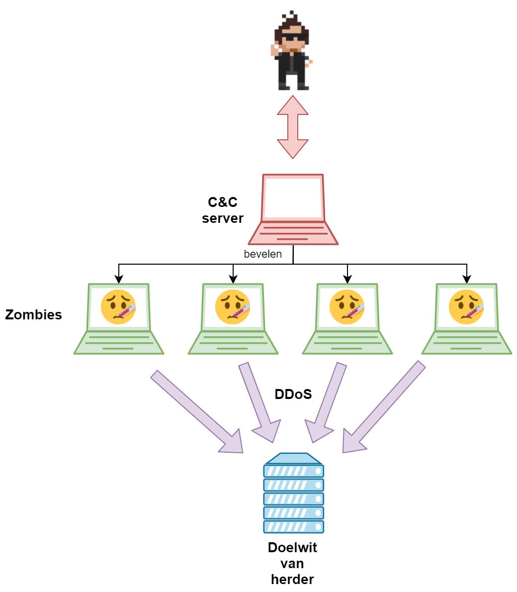 Wanneer een cybercrimineel een grote groep computers nodig heeft, dan zal deze via voorgaande malware-technieken proberen zoveel mogelijk computers te besmetten met zijn zombie-virus. Dit virus zal twee dingen doen: