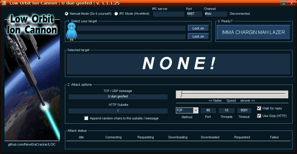 Low Orbit Ion Cannon is zo’n typische scriptkiddie tool: eenvoudig in gebruik, met potentieel grote gevolgen voor het slachtoffer. Deze tool, wanneer meerdere gebruikers hem samen gebruiken, voert DDOS-aanvallen op het doelwit uit. In 2010 werd de tool bijvoorbeeld gebruikt om de servers van Visa, MasterCard en Paypal uren lang lam te leggen als wraak op het feit dat deze betalingsdiensten geen betalingen voor WikiLeaks meer aanvaardden. Meer informatie.