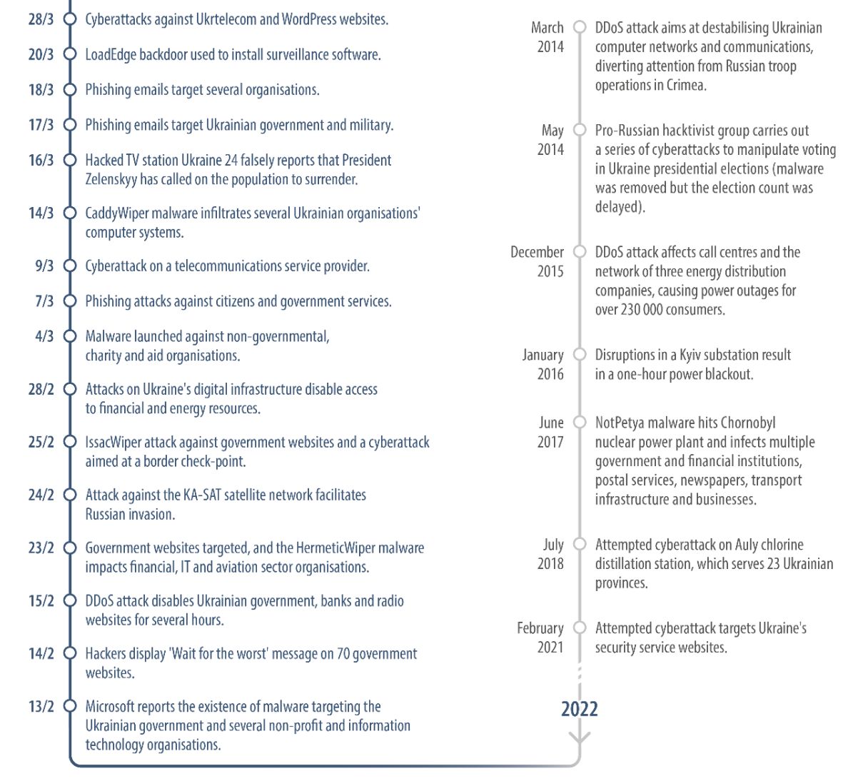 - Georgia (2008): synchroon met de Russische militaire invasie werden Georgische overheidsites en infrastructuur lamgelegd — de eerste keer dat cyberaanvallen parallel liepen met een militaire inval.