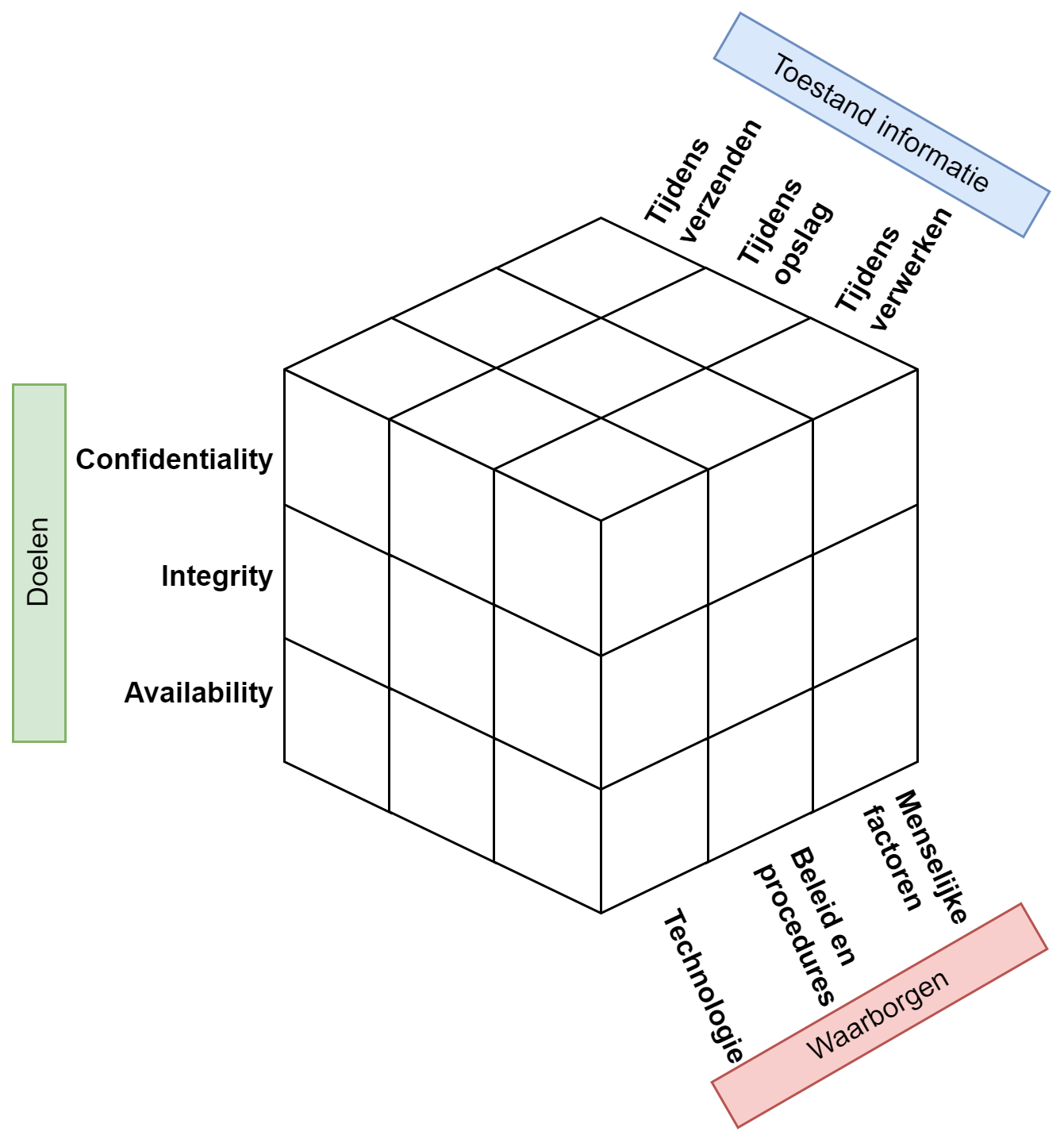 De zogenaamde McCumber kubus, ontwikkeld door John McCumber in 1991, geeft een goed beeld weer waarom het steeds belangrijk is goed te beseffen binnen welke context we praten. Deze kubus stelt een model voor dat kan gebruikt worden om je ervan te vergewissen dat je aan alles denkt wanneer je je informatie wilt beschermen. De kubus bestaat uit drie dimensies en iedere dimensie bestaat uit een aantal aspecten. Enkel wanneer we alle aspecten van alle dimensies in onze beveiligingsaanpak voorzien kunnen we hopen dat we onze C.I.A. doelen hebben bereikt.