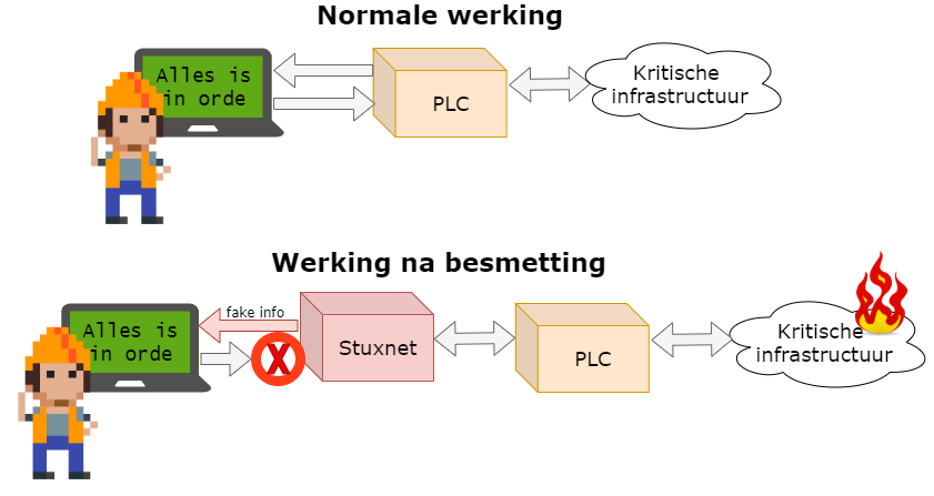 Wat Stuxnet deed was zich tussen de hardware en de software nestelen. Als een worm besmette het laptops en computers en zocht het of er PLC-bedieningssoftware aanwezig was op het toestel. Als dat het geval was dan plaatste het zichzelf er tussen in zodat het: